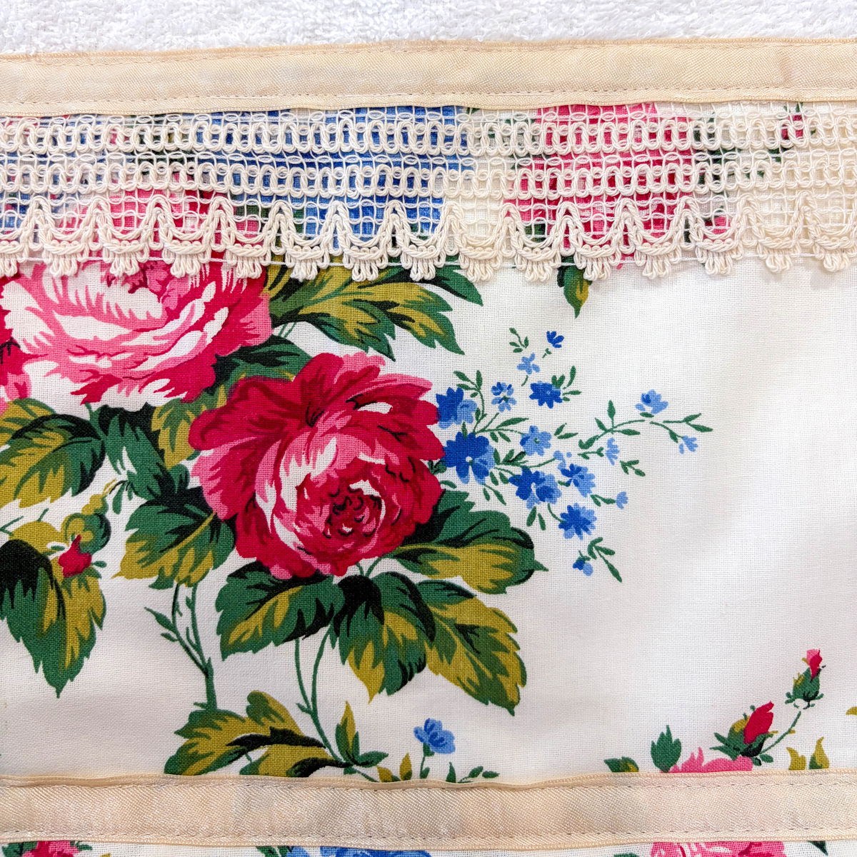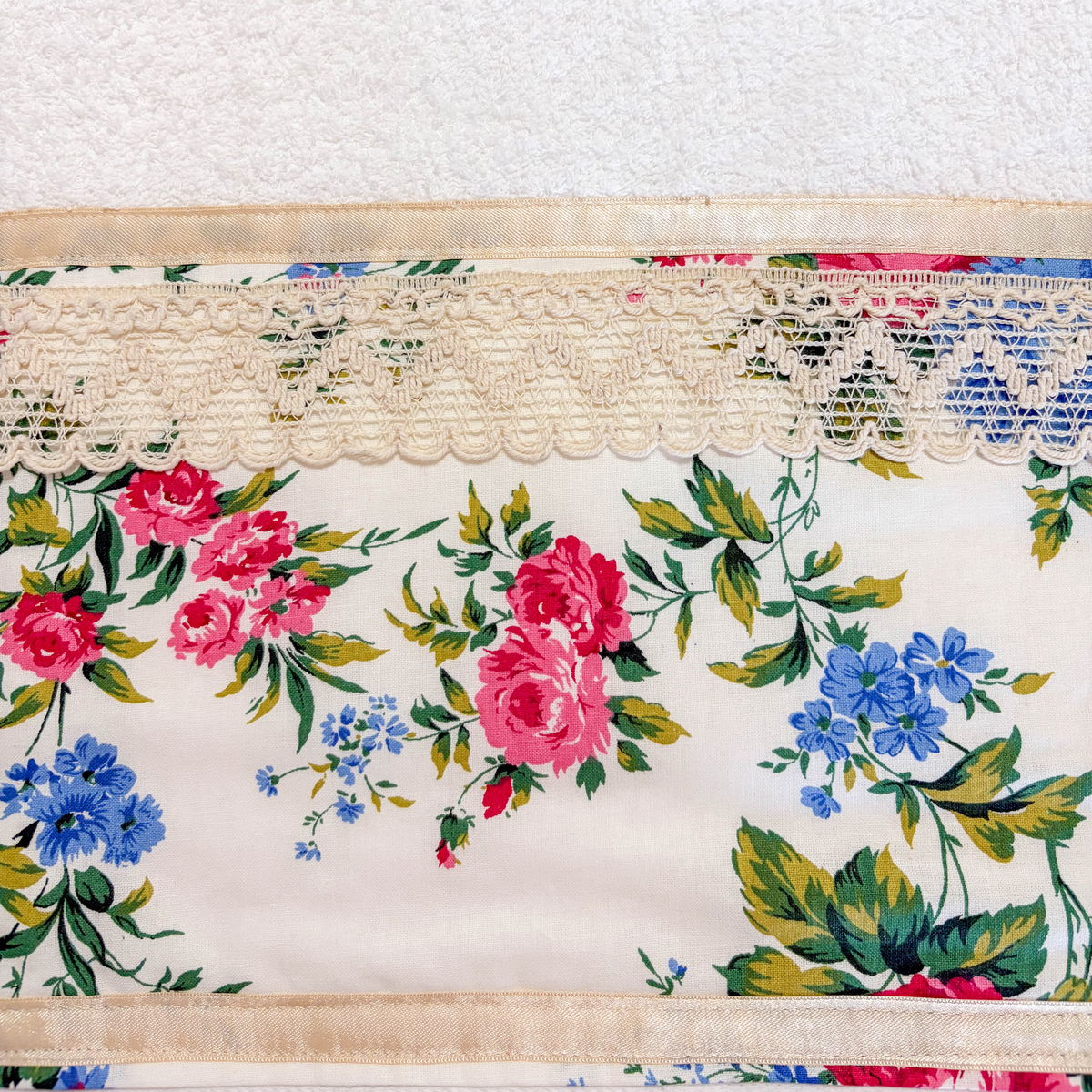 Las toallas y toallones Jardín Vintage tienen un aire cálido y clásico. En la parte inferior llevan una guarda de tela floral sobre fondo crema, con flores en tonos rosa, azul y verde, combinada con puntillas y cintas en tono beige. Es un diseño acogedor, con estilo vintage, ideal para dar personalidad al baño o armar un set especial para regalo. Puede haber pequeñas diferencias en las puntillas y detalles entre piezas del mismo modelo, sin cambiar el diseño general.