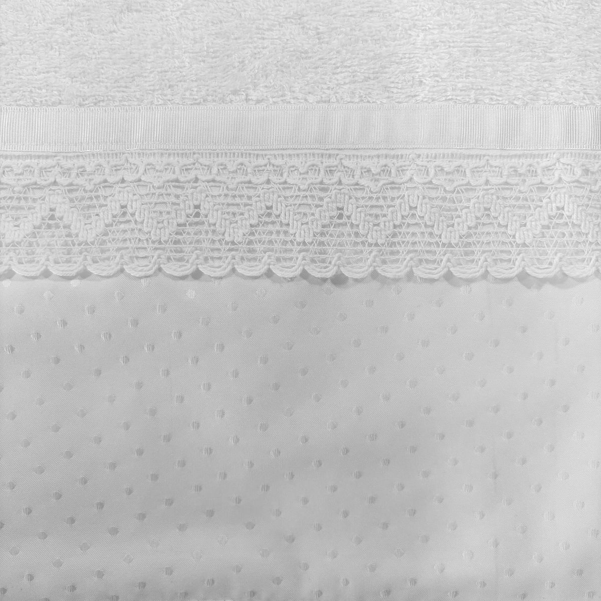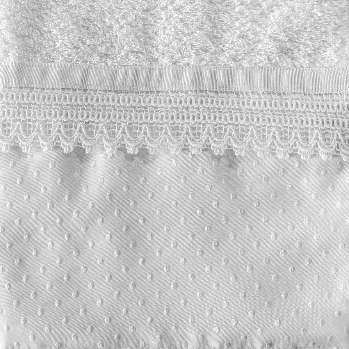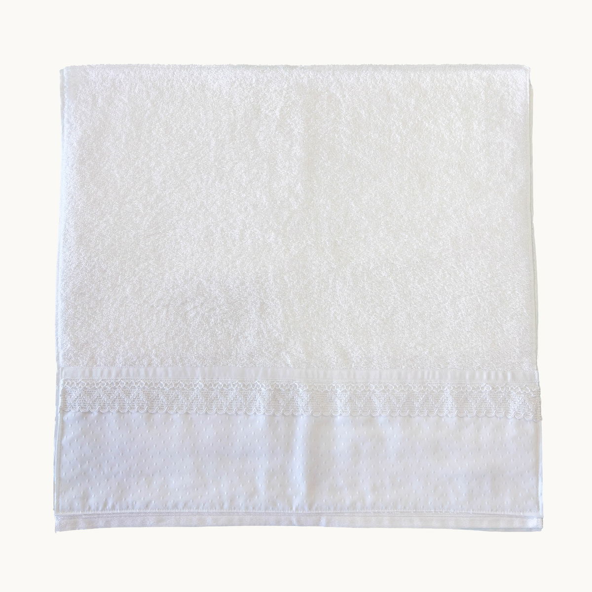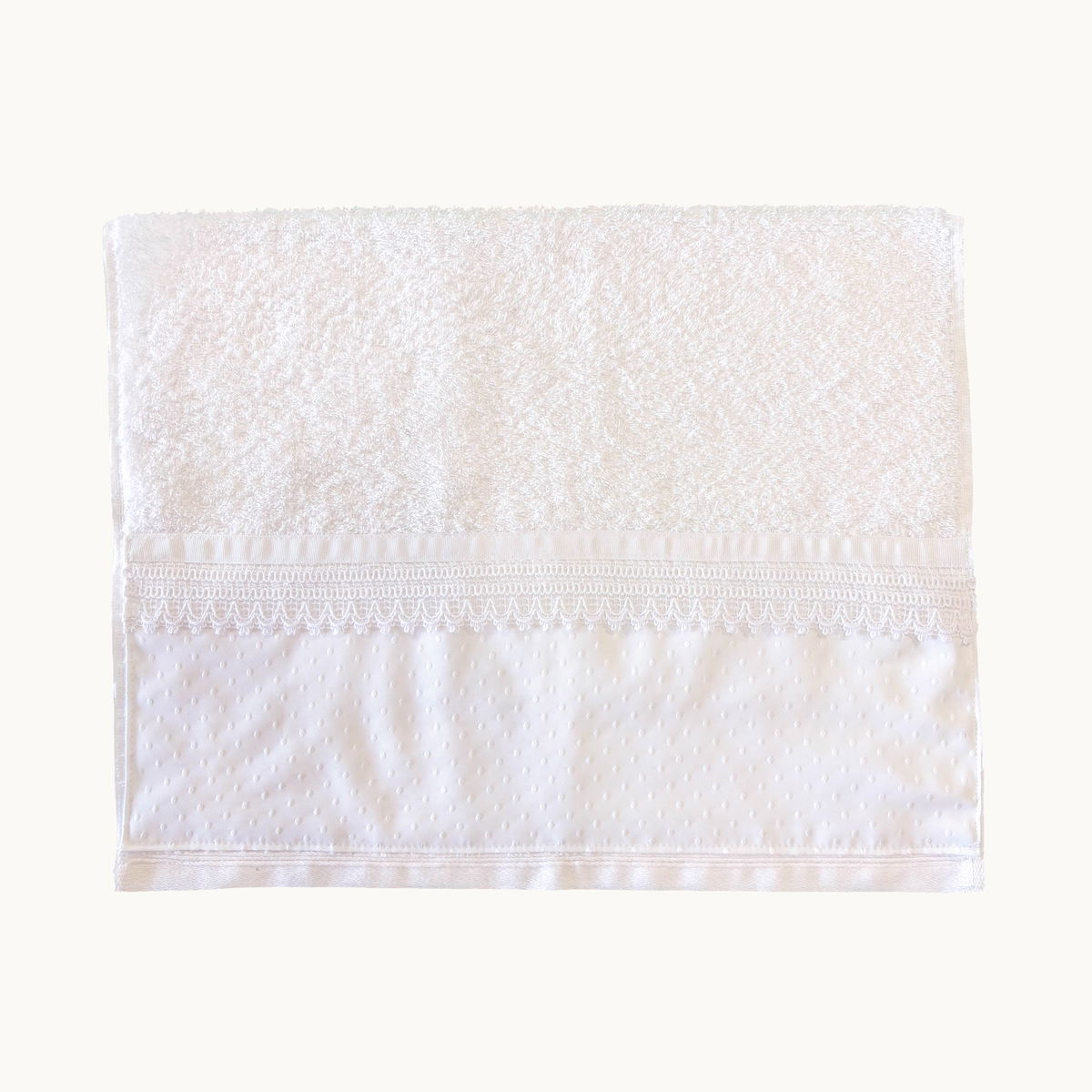 Las toallas y toallones Blanco Romántico son completamente blancas pero llenas de detalles sutiles. La guarda inferior está realizada en tela blanca al tono con textura de pequeños lunares, combinada con puntillas y cintas también blancas. El resultado es un diseño neutro, delicado y fácil de combinar con cualquier baño, perfecto tanto para uso diario como para invitados o regalos minimalistas.